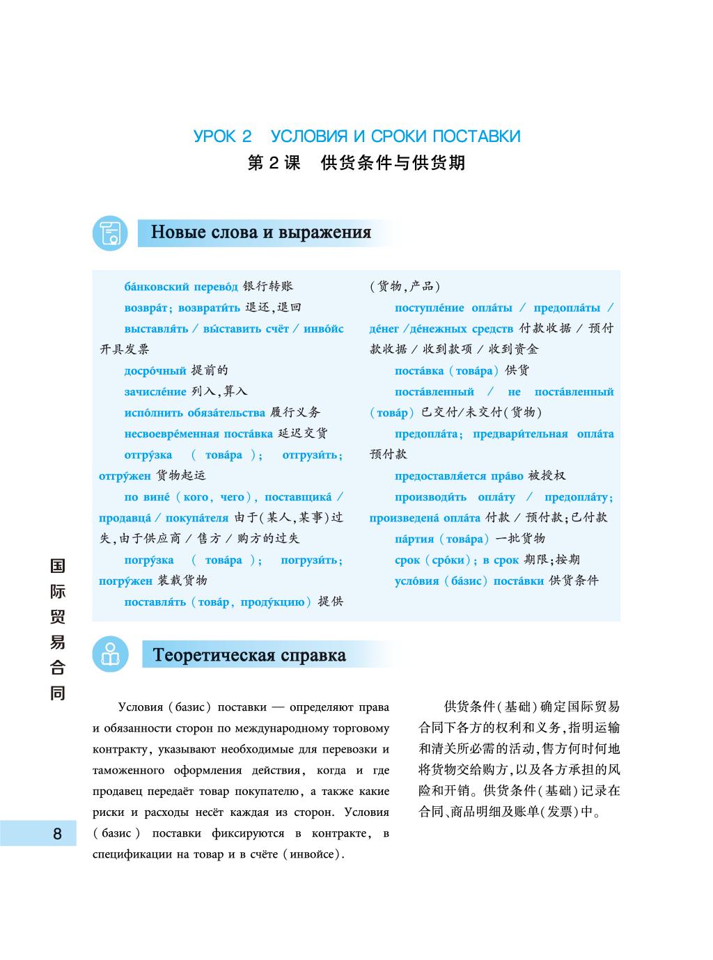 本教材章节内容结构编排具有系统性和创新性。教材内容分为两大部分,每个部分8课,共计16课。第一部分主要涵盖贸易合同要项,第二部分涵盖不同领域贸易合同。本教材适用于高等院校俄语专业学生、参加成人俄语自考的考生、各类俄语培训班学员,也可供广大俄语爱好者以及商务人员学习使用。