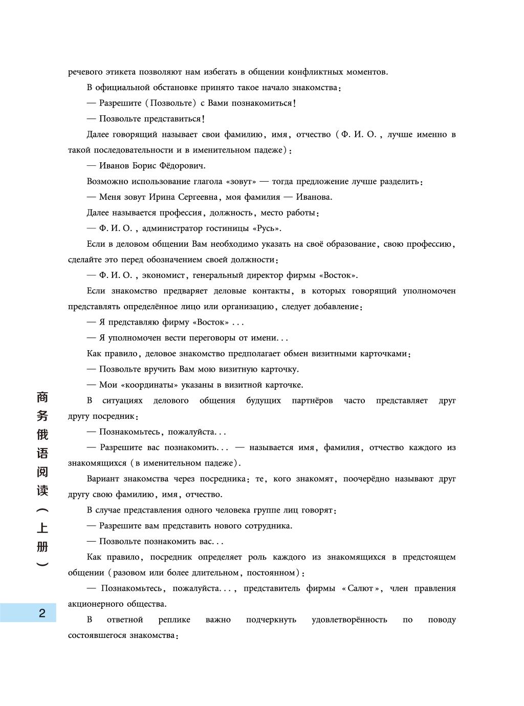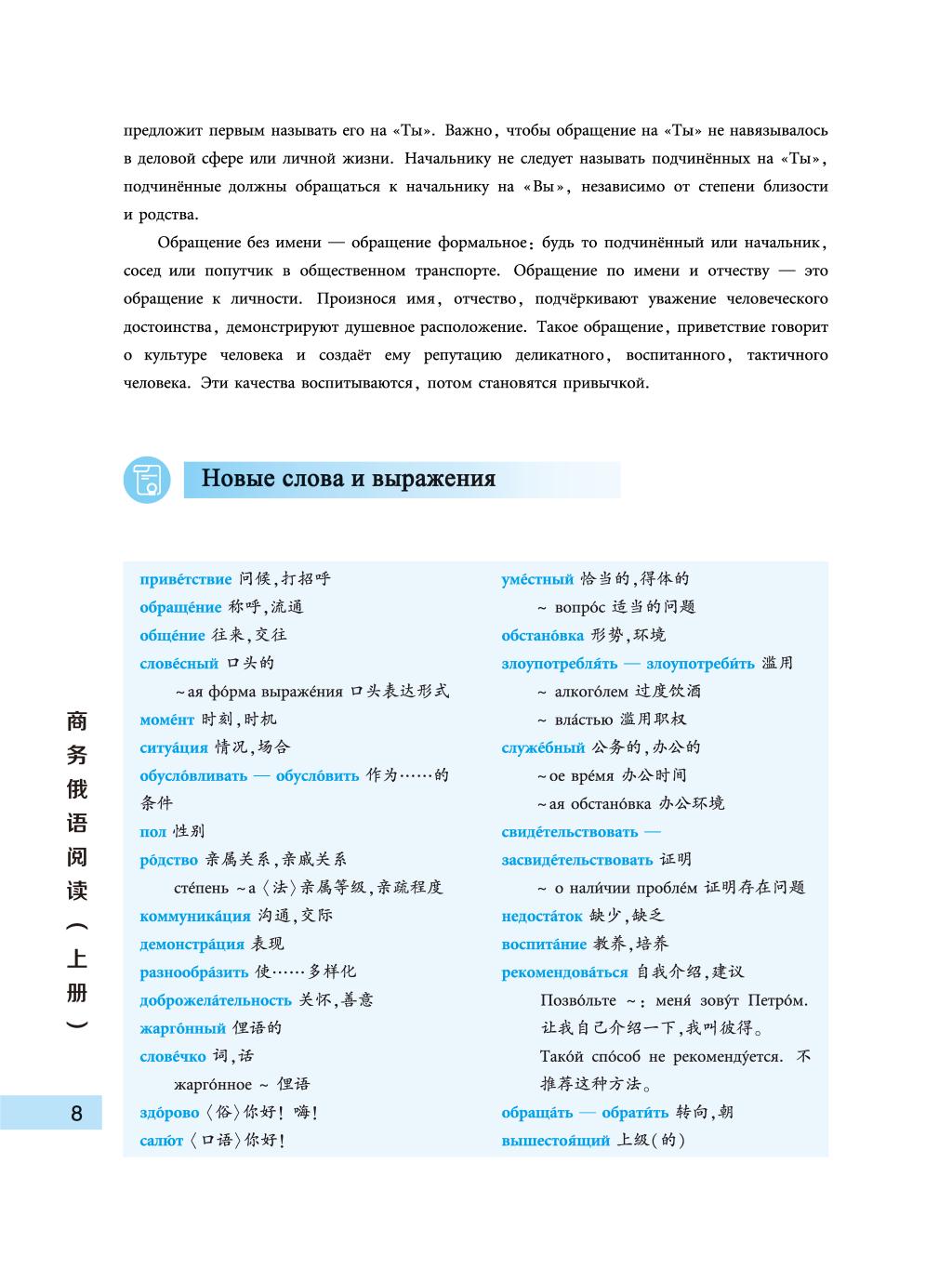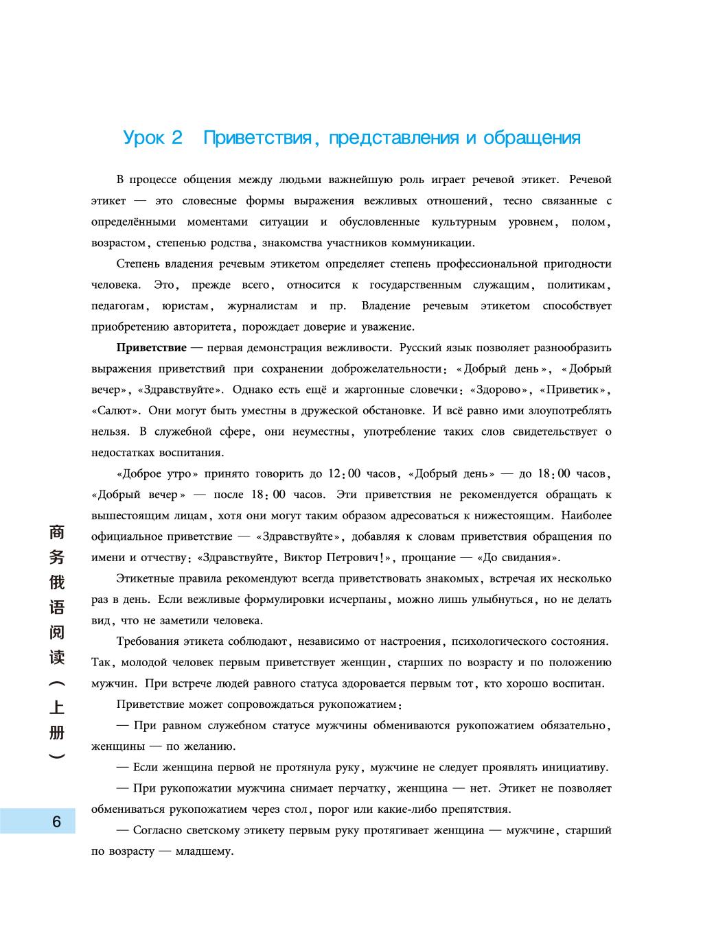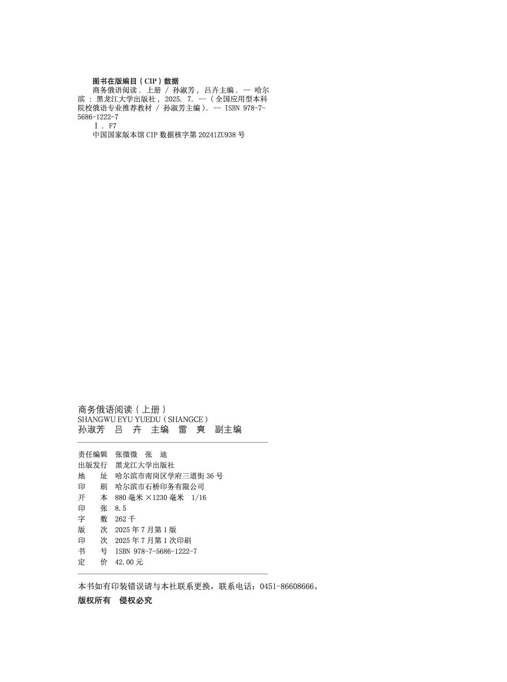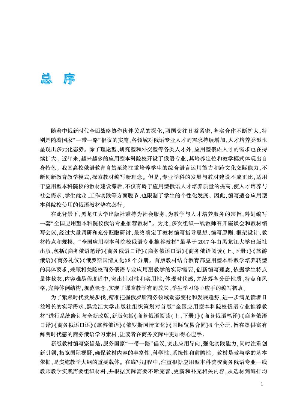 《商务俄语阅读(上册)》精心筛选了俄罗斯近年来出版的各类商务俄语书籍及权威网站上最新内容作为素材,体现了鲜明的时代感,从选材到编排均体现了教材编写的各项要求,具有科学性、系统性、知识性、可读性强和内容新等特点,旨在全面强化学习者的语言理解、分析及应用能力,有效促进知识的吸收与内化,稳步提升商务俄语阅读水平。 较之首版,在专题设计、教材结构和内容上均进行了较大更新和调整,涵盖四个专题,包括商务言语礼仪、国际贸易活动、海关实务、俄罗斯商务旅行。其中商务言语礼节涉及商务交际中语言规范与言语礼仪细节,展现商务交际中的专业风范;国际贸易活动覆盖了国际贸易流程、策略及实践应用,旨在提升学习者在全球化商务环境中的竞争力与适应性;海关实务涉及海关法规、流程及实际操作步骤;俄罗斯商务旅行提供赴俄商务活动出行建议与实用信息。 这种结构调整不仅增强了教材的实用性与针对性,也为学习者构建了一个循序渐进、深入浅出的商务俄语知识体系。