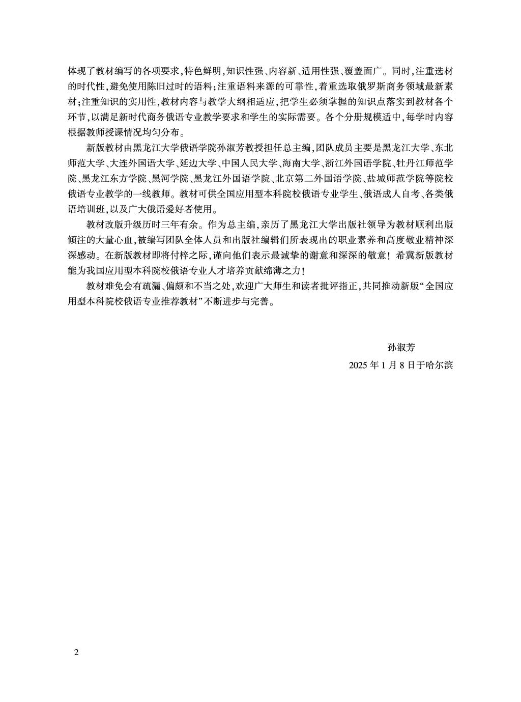 本册共计 18 课,配有拓展知识的课文、常用词语、重点和难点注释,精心编写的练习,旨在检验阅读理解能力,同时附有参考答案,便于读者更有效地复习与巩固所学内容。适用于我国高等院校俄语专业、成人俄语自考、各类俄语培训班,也供广大俄语爱好者及商务人员学习使用。