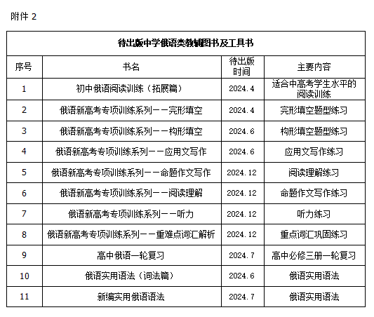 2. 稿件内容:与中学俄语考试、教学(如词汇、语法、阅读、写作、习题集、教材解析、学业水平测试、总复习)相关,具有独创性,主题须明确,文题相符;同时,书稿的主要方向和内容应尽量避免与我社已出版的中学俄语系列图书(见附件1)重合,且须紧扣中学俄语新课标及大纲要求,关注新高考题型改革,与教材紧密联系,在注重基础知识的同时,还要注重对学生核心素养的培养与提高;词组、例句、阅读材料等要求新颖,与时俱进。