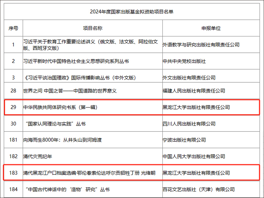 近日,2024年度国家出版基金资助项目评审结果正式公布,我社申报的《中华民族共同体研究书系(第一辑)》《清代黑龙江户口档案选编·鄂伦春索伦达呼尔贡貂牲丁册 光绪朝》成功入选。